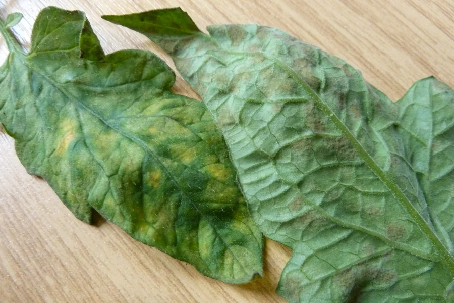 لکههای زرد مایل به سبز بدون حاشیه مشخص در سطح بالایی برگهای مسنتر. در زیر برگ، رشد قارچ به صورت مخملی سبز تا قهوهای دیده میشود. لکهها در مراحل بعدی به هم پیوسته و قهوهای میشوند. برگهای آلوده خشک شده اما روی گیاه باقی میمانند. گلها سیاه شده و میریزند. میوهها ابتدا لکههای سیاه صاف در انتهای ساقه دارند که بعدها فرو رفته، چرمی و خشک میشوند.